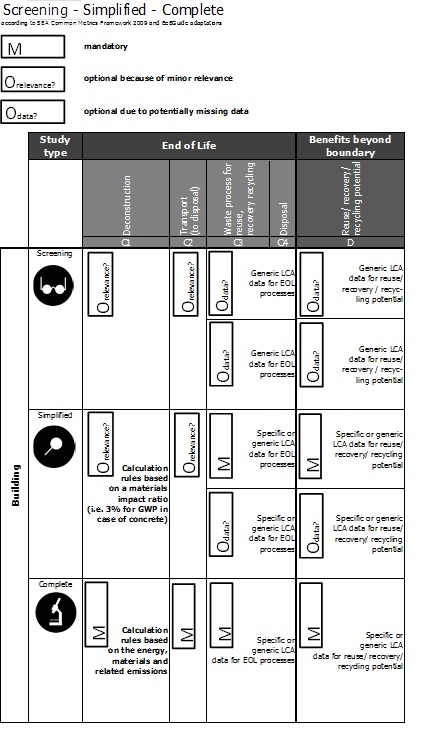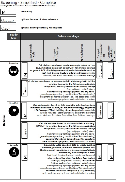 Table 5 gives specific information about how the three LCA study types (screening, simplified and complete) are currently implemented within the EeBGuide framework. Screening describes the first approach, where most of the information on the building is still very rough (e.g. within the design stage): thus default values of generic assumptions need to be chosen and used. In a simplified LCA study, detailed data are used, and a greater number of life cycle stages are addressed. Complete LCA reflects the most comprehensive and detailed application of the LCA methodology. For each level, Table 5 highlights those modules that are mandatory, optional because of their minor relevance, or optional because of currently missing data. The term ‘mandatory’ here specifically relates to projects of the Energy-Efficient Buildings Initiative (E2B EI). For other projects, or for the secondary audience of EeBGuide, this can be considered as a guideline.